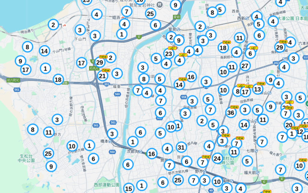 地図上に現在売りに出されている土地が一目見てわかるようになっています。