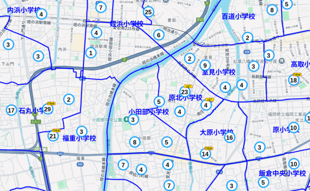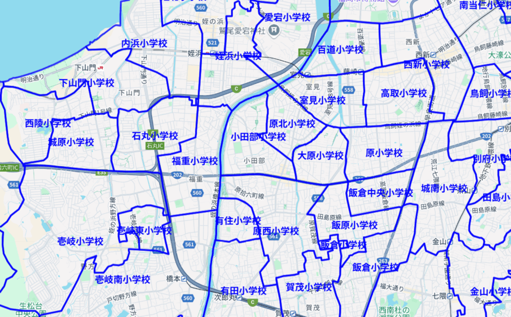 さらに、地図上に小学校区、中学校区も表示可能です!