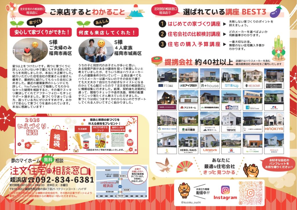 2026年 最初の「家づくり相談会」開催です 初めてご予約ご来店の方に昨年、大好評だった「住宅会社比較表(福岡版)」が入っているいえづくり福袋をプレゼント! ご相談、その後のサポートはすべて無料です。 前の記事へ |
