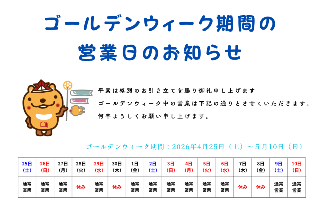ゴールデンウィーク期間中の営業日のお知らせ